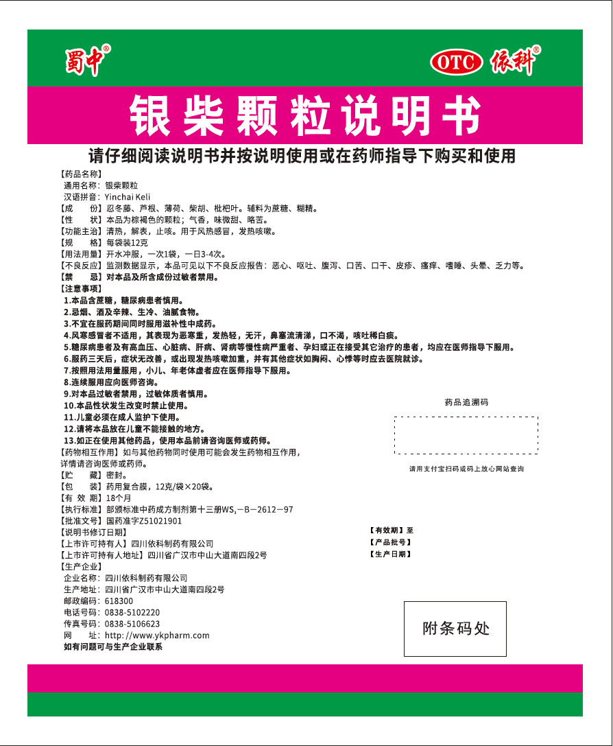 我公司银柴颗粒【批准文号:国药准字Z51021901,规格:每袋装12克】按照“国家药监局关于修订金银花露等非处方药说明书的公告(2026年第29号)”要求,对“不良反应”、“禁忌”项进行了明确,同时完善了“注意事项”内容。具体修订情况如下: